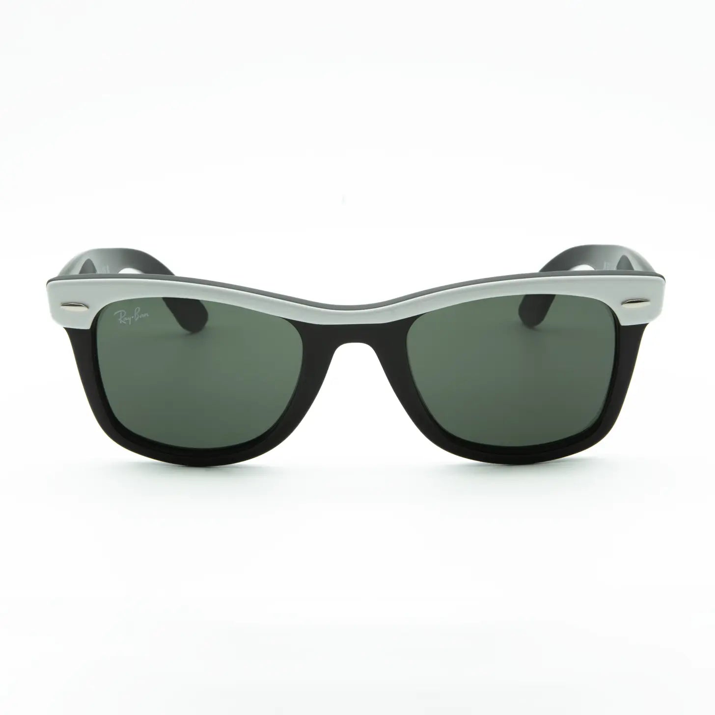 The Ray-Ban Wayfarer Street Neat combines a glossy black frame with contrasting white browbands and green lenses for a modern, distinctive style that won't go unnoticed.